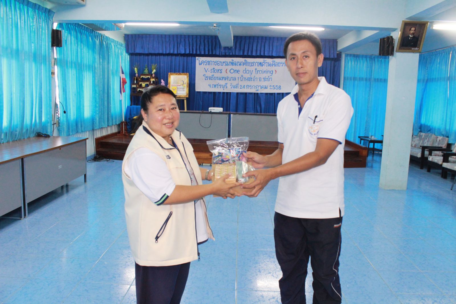 มอบของที่ระลึกเยลลี่แด่คุณครูมงกุฏ ตรีเงินกุล ครูประสานงานโครงการวีสตาร์