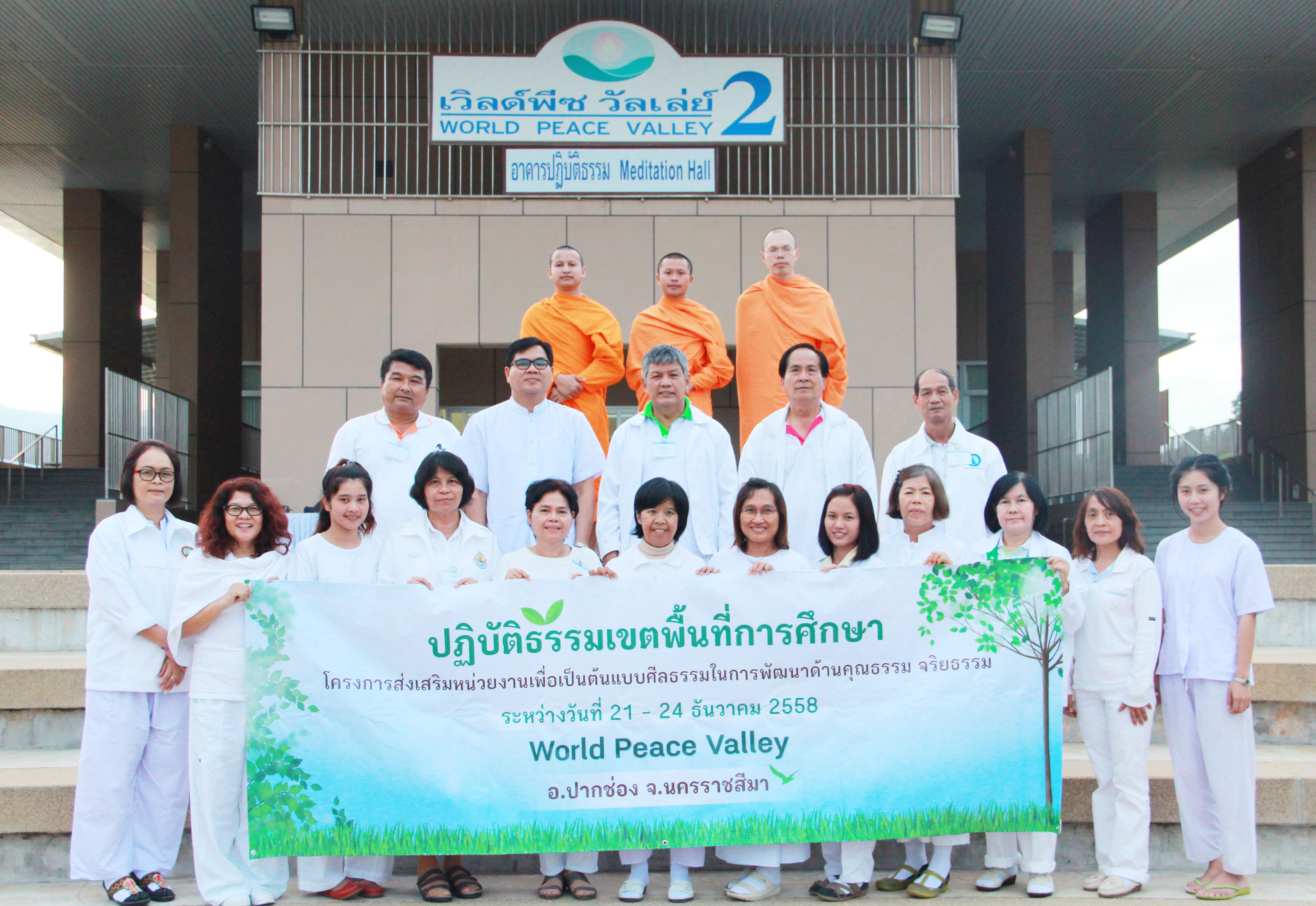 วันที่ 21-24 ธันวาคม 2558 ที่ผ่านมาชมรมพุทธศาสตร์สากล ในอุปถัมภ์สมเด็จพระมหารัชมังคลาจารย์ ได้จัดปฏิบัติธรรมเขตพื้นที่การศึกษารุ่นโครงการส่งเสริมหน่วยงานเพื่อเป็นต้นแบบศีลธรรมในการพัฒนาด้านคุณธรรม จริยธรรม ครั้งที่ 2 จากผู้บริหารและเจ้าหน้าที่สำนักงานเขตพื้นที่การศึกษาทั่วประเทศที่เข้าร่วมโครงการฯ จำนวนกว่า 20 ท่าน ณ World Peace Valley2 อ.ปากช่อง จ.นครราชสีมา เพื่อให้ผู้บริหารการศึกษา ผู้ประสานงานโครงการฯ และเจ้าหน้าที่เขต ได้มีโอกาส ทำทาน รักษาศีล ฟังธรรม เจริญสมาธิ พักกายพักใจ ไปกับการปฏิบัติธรรมท่ามกลางธรรมชาติส่งท้ายปี และได้พบปะแลกเปลี่ยนตลอดจน เป็นกำลังใจและเป็นเครือข่ายการทำงานด้านศีลธรรมที่เข้มแข็งร่วมกัน