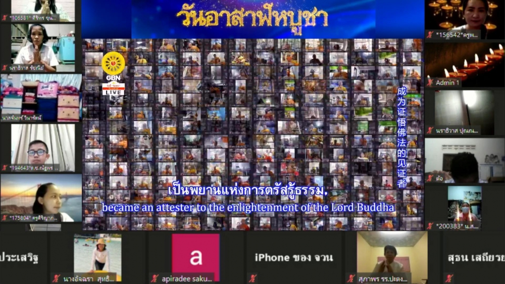 วันที่ 24 กรกฎาคมที่ผ่านมา เนื่องในวันสำคัญสากลโลกคือวันอาสาฬหบูชา หรือวันขึ้น 15 ค่ำ เดือน 8 เป็นวันที่พระพุทธเจ้าทรงแสดงพระธรรมที่ตรัสรู้เป็นครั้งแรก โดยแสดงปฐมเทศนาอันได้แก่ ธรรมจักรกัปปวัตตนสูตร และเกิดพระรัดตนตรัยครบทั้ง 3 ประการ คือ พระพุทธ พระธรรม พระสงฆ์ จึงถือได้ว่าวันนี้เป็นวันเริ่มต้นประกาศพระพุทธศาสนาแก่ชาวโลก บุคลากรทางการศึกษา นักเรียนและนักศึกษาทั่วประเทศจึงได้ร่วมกิจกรรมการจุดประทีปถวายเป็นพุทธบูชาในรูปแบบออนไลน์ผ่านแอปพลิเคชั่น Zoom เพื่อเติมบุญกุศล และเสริมสิริมงคลในวันสำคัญต่างๆ ตลอดจนสร้างกำลังใจในสถานการณ์การแพร่ระบาดของโรคติดเชื้อไวรัสโคโรน่า 2019